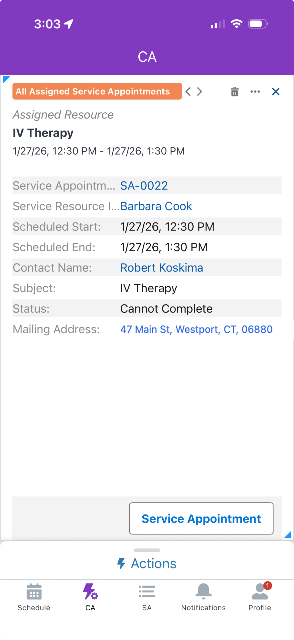 A case is assigned to a field technician. Before heading out, they can check the service appointment, view required equipment, see the address, follow the optimized route, and know which teammates are assigned. Missing gear? Contact the teammate who has it before leaving.