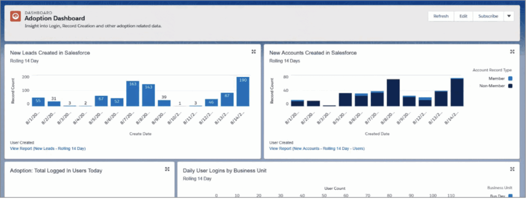 Building a set of comprehensive dashboards can help your team see at-a-glance what’s working and what’s not, so you can continue to iterate. Not only does it give you a sense of your project outcomes, but also how well the system is adopted within your team.