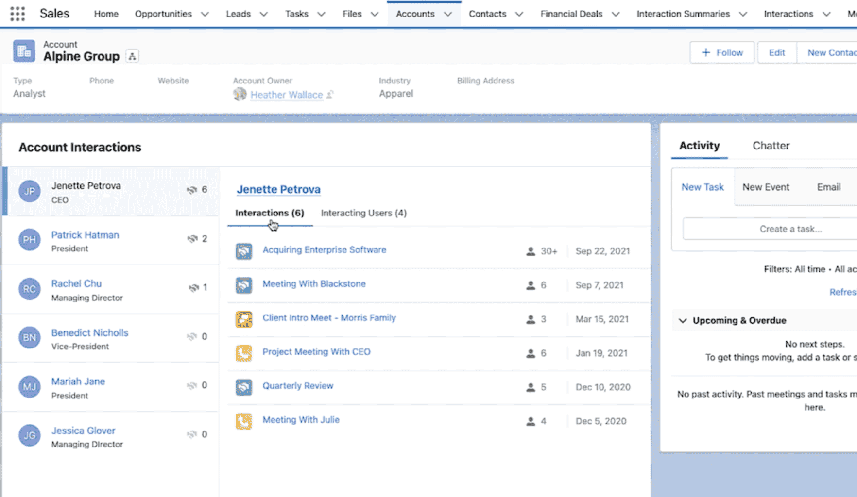 The ARC does nearly everything the Relationship Heatmap component can do and also displays related lists. It allows you to see a history of client interactions in a single pane and use it to decide the most efficient way forward. This feature is relevant because as a firm grows, its volume of data increases exponentially. Month after month, it becomes a massive operational challenge for firms to sort through the data for something as simple as finding out when the last meeting took place, or when the last portfolio valuation happened.