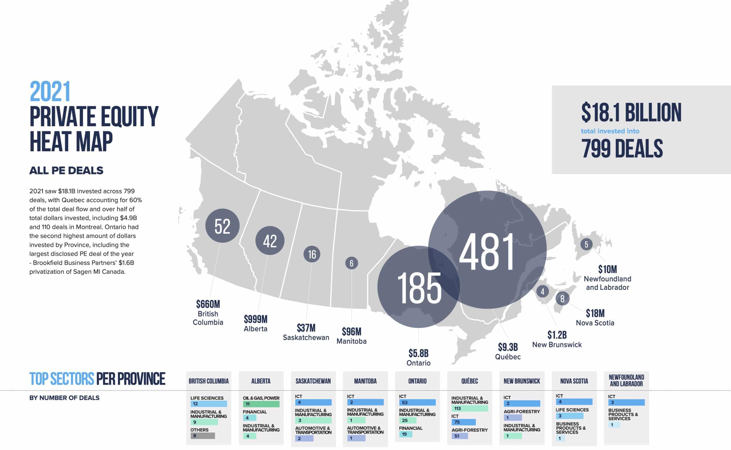 - 84% of all private equity deals were under $25M CAD, highlighting the strong market for Canadian investment in small and mid-cap companies – considered the backbone of the Canadian economy.