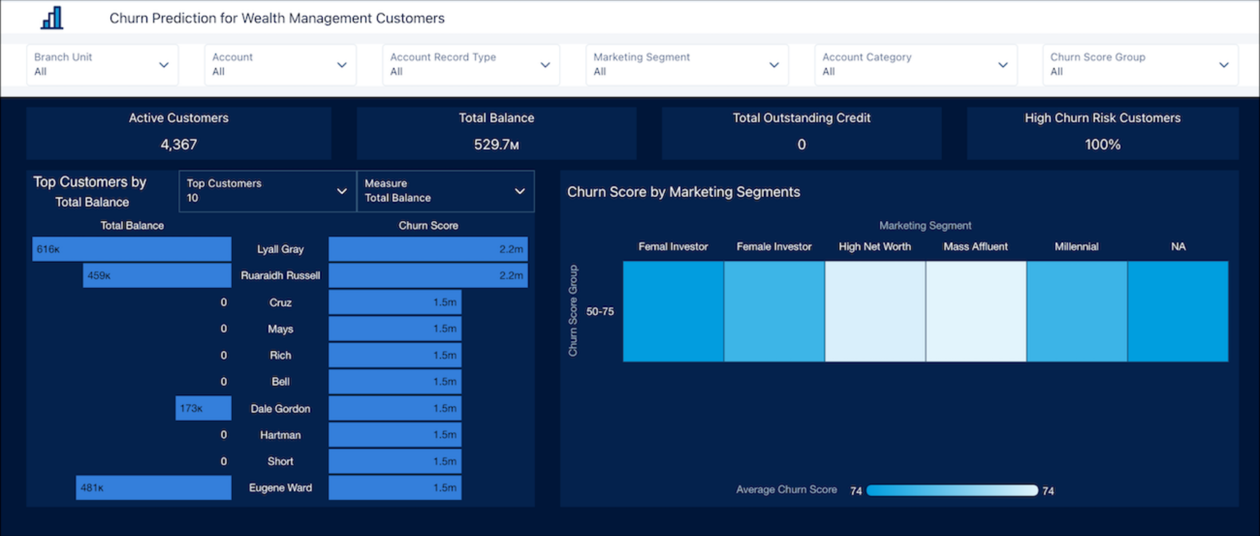 Out of the box with Financial Services Cloud, advisors can use all of this client servicing data not only to ensure white glove service but to also begin predicting risk; in the churn prediction dashboard below (which comes out of the box with CRM Analytics for Financial Services Cloud), you can see an example of how top wealth firms can monitor client health and take action on the predictions if a client is at risk of termination, or evaluate who are your strongest and most loyal brand ambassadors.