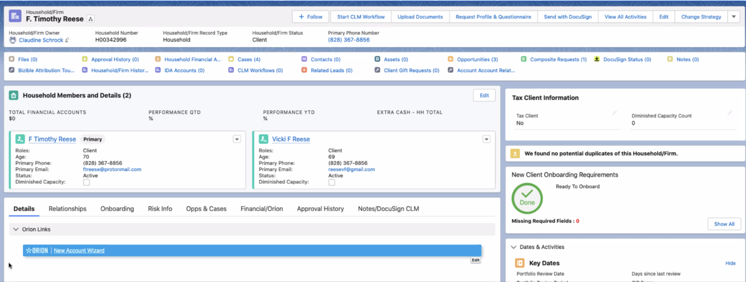 In the example below, Orion is integrated so seamlessly into Salesforce and accessed through simple quick actions that it looks like a client service team member is completing the transaction in Salesforce, but it is actually happening in Orion. The client service request is memorialized as a case in Salesforce, available from the client page for reference, and the operations user can see all the submitted information to take action directly from the case screen.