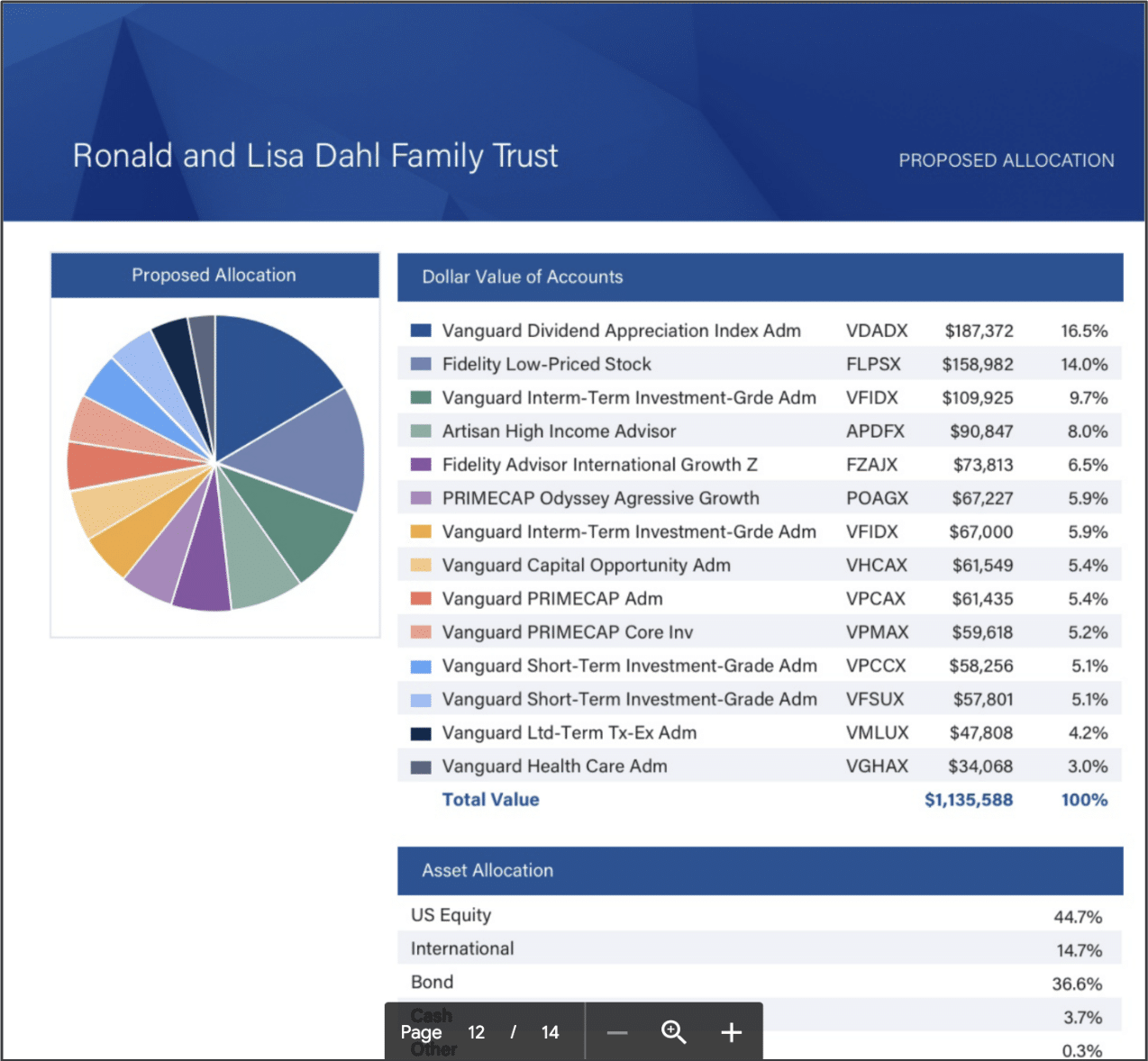 In these servicing requests, the relationship manager or client management team can intake the current holdings for a client, see information integrated from other financial planning systems, select a model portfolio, and adjust the new allocation to fit what they are recommending to the client – and then generate a PDF or presentation of the proposed adjustments.