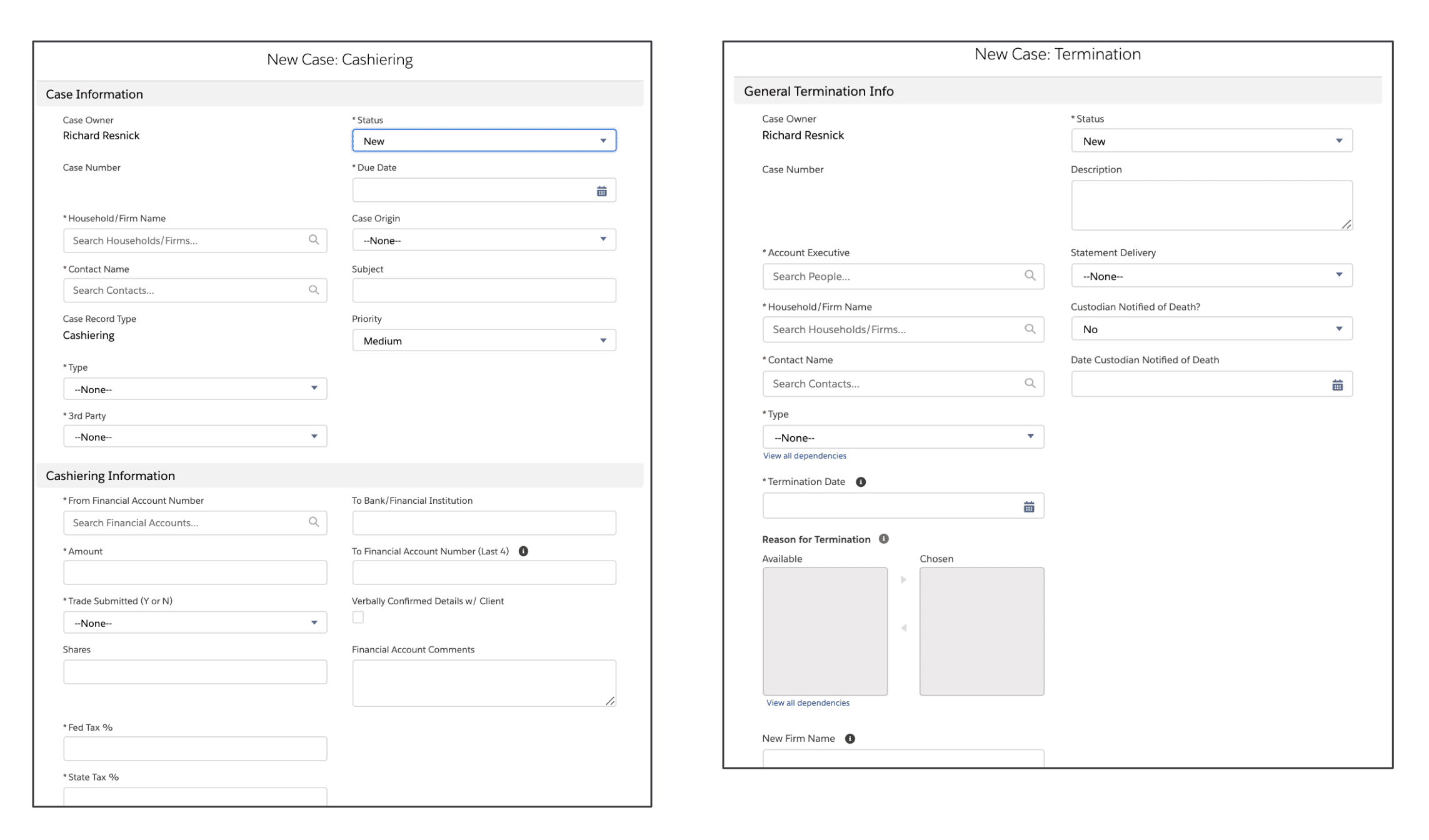 Each type of service request can be customized to gather the appropriate detail for the request; distribution cases will look very different and require different details than cashiering, trade request, or termination cases.