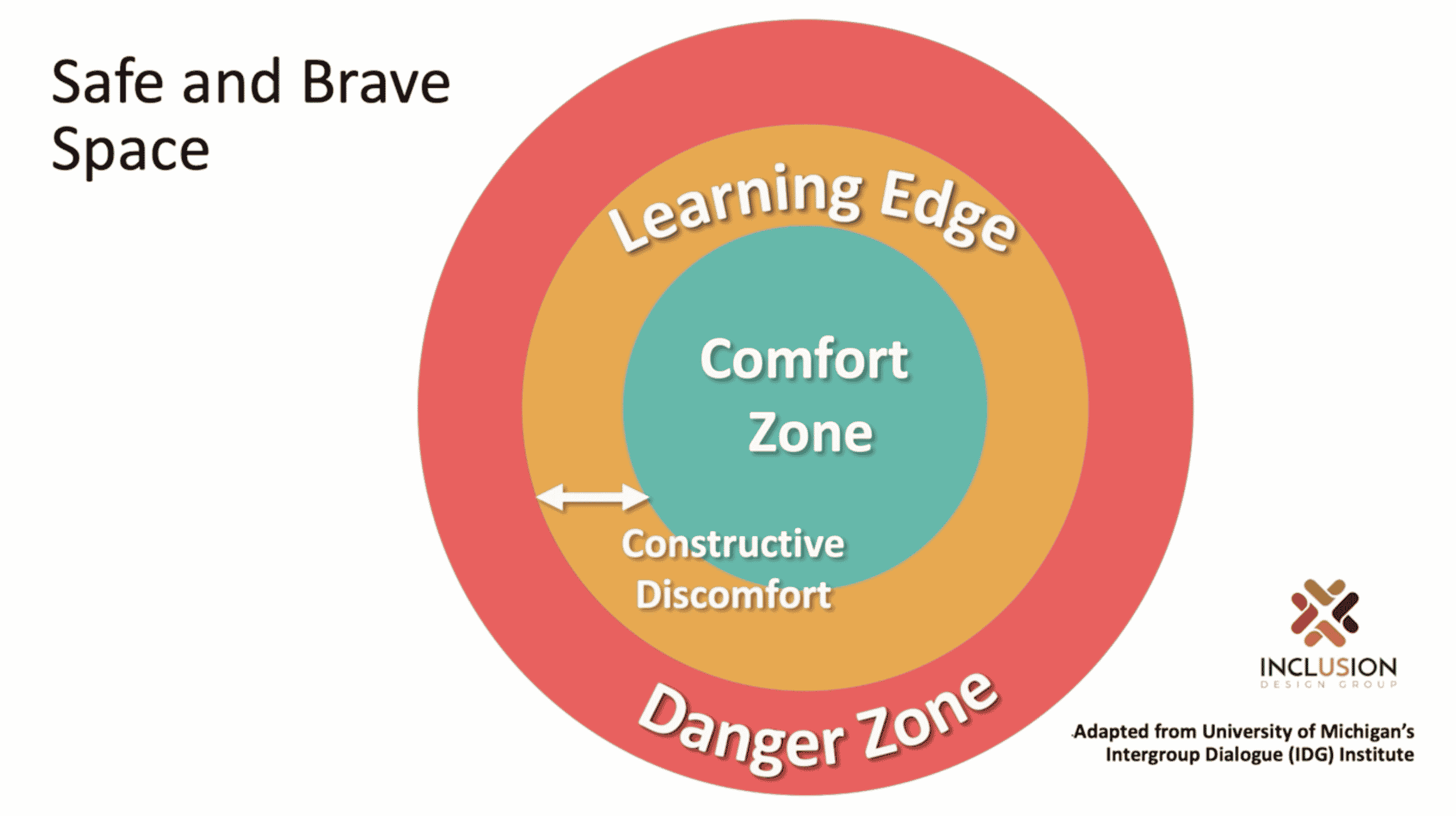 Below is a constructive discomfort type of model from the University of Michigan’s Intergroup Dialogue Institute. When you move from the green Comfort Zone to the orange Learning Edge, you are moving to an area where you may add or even change your view of the world. You are interacting with people with different perspectives than you, and there may be times that those conversations can get heated and evolve into the Danger Zone.