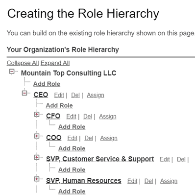 When you build out your role hierarchy, think of this less like an Org chart, and more like a record sharing hierarchy. Often your Role Hierarchy configuration will closely align with your org chart, but not always.