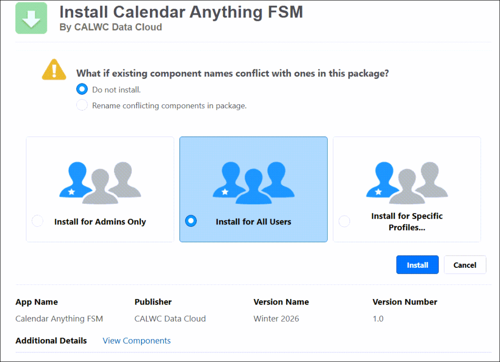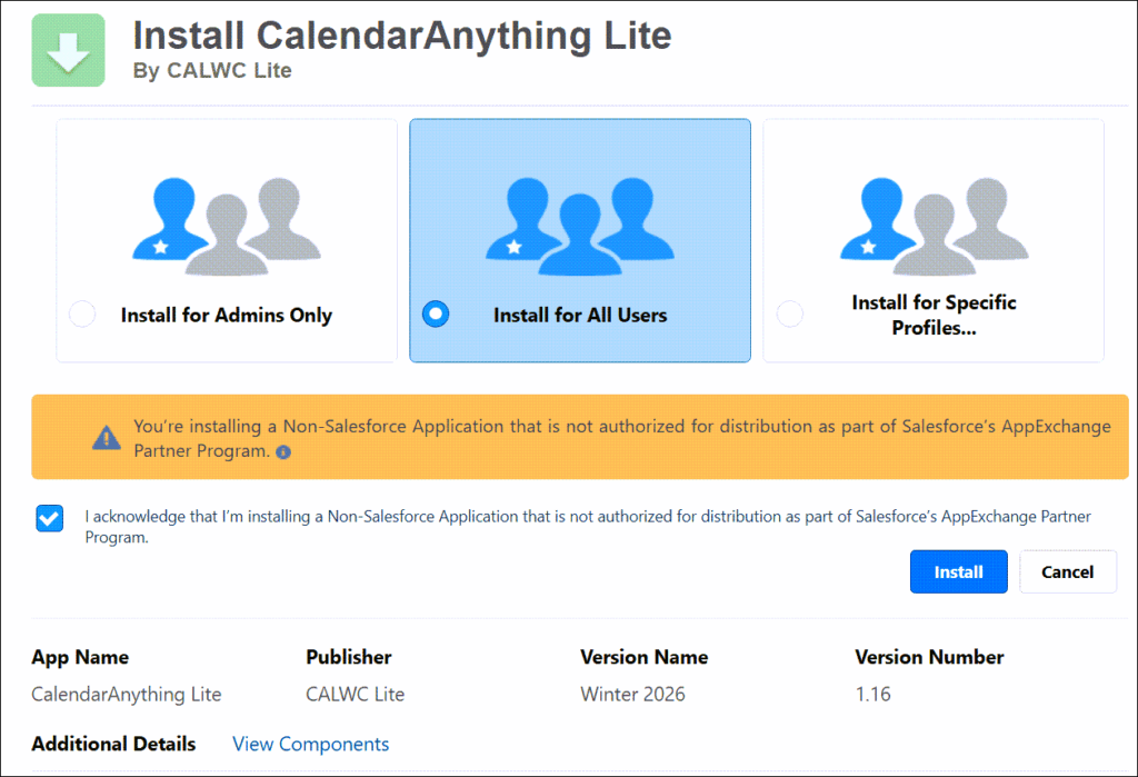 - Install CalendarAnything LWC 1.150. Choose the option Install for All Users.