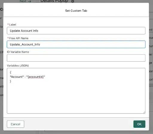 The detail popup can now include custom tabs. Custom tab configuration is leveraging flows already created using Salesforce Flow Builder. Custom tab configuration form is accessed from Calendar Create and Edit wizard, Detail Popup step. Tab label and Flow API name is required. There is an option to pass variables to the flow in JSON format.