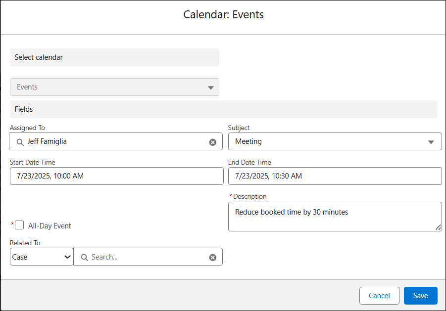A user can update a booked meeting event to start or end outside of the originally configured timeslot. In the example below, the user updates the booked meeting event to end 30 minutes earlier than the configured timeslot.