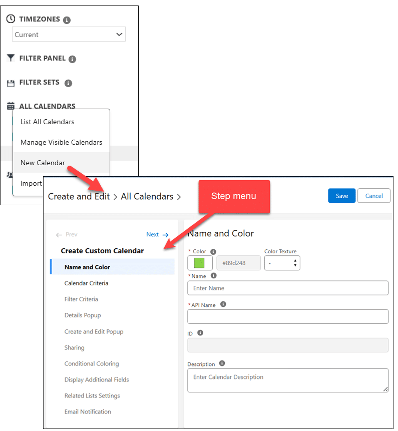 Begin by accessing the Create Custom Calendar wizard, also known as Calendar Setup. On the CalendarAnything menu, right-click All Calendars then select New Calendar. The Create Custom Calendar pages contain a menu of configuration steps on the left and fields to configure the selected step on the right.