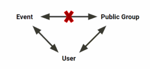 Notice the object relations. User relates to both Event and Public Group. However, no relationship exists between Event and Public Group. So how does the application determine whether a user on an Event record is a member of a specific public group? This issue can be resolved by a Dynamic List.