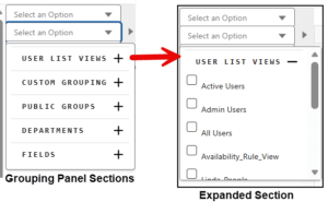 Following is a list of checkboxes that appear under Grouping Options in General Settings. Use the checkboxes to choose which sections appear in the grouping panel.