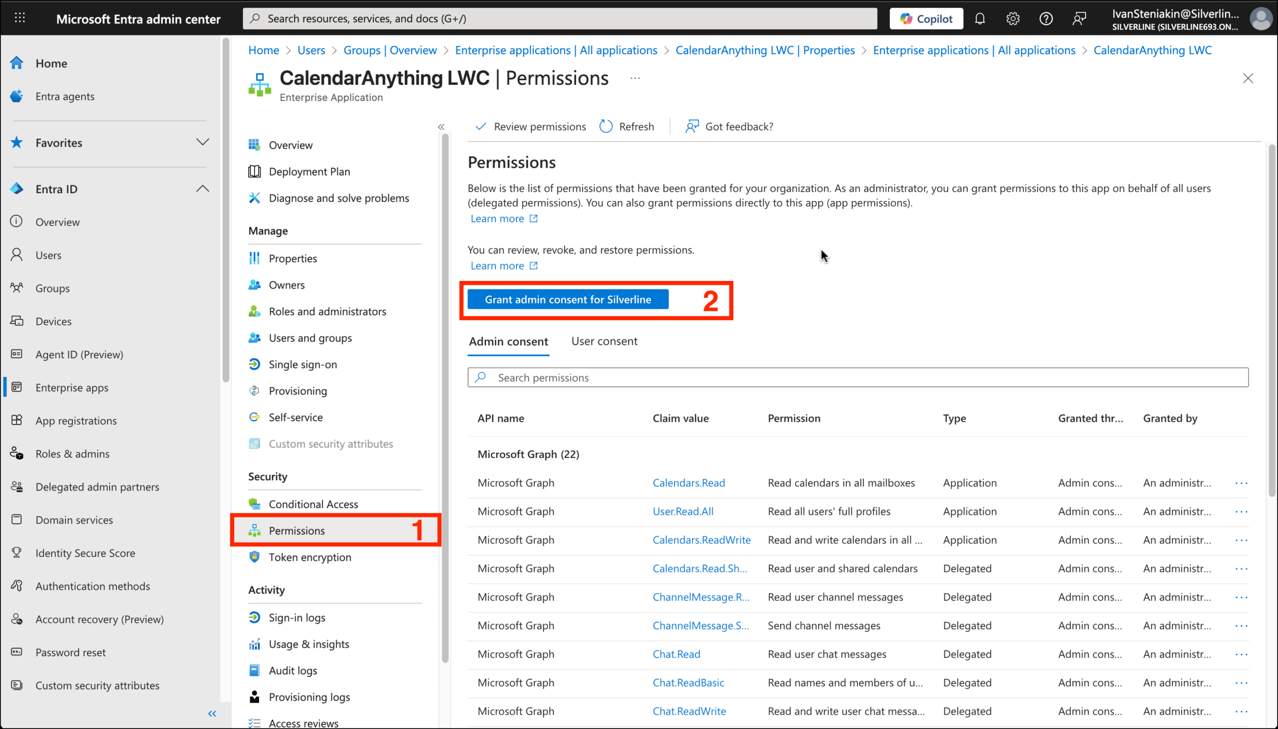 - Click Grant admin consent for … button (#2 on image below).