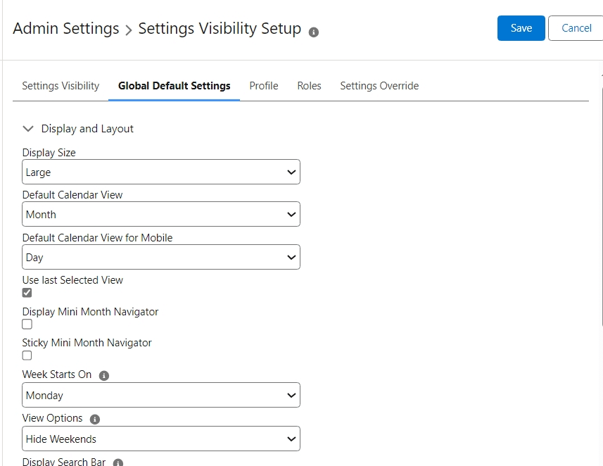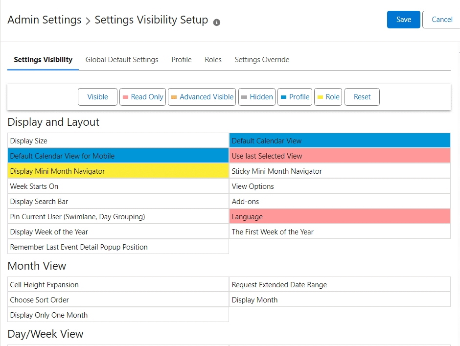 As a system administrator, you want to ensure that users’ have the appropriate look, feel, and customization access for their calendars. Calendar Anything LWC provides the Settings Visibility Setup feature for you to customize settings according to the level of freedom or restriction required. The Settings Visibility Setup page contains configuration options represented by the following tabs: