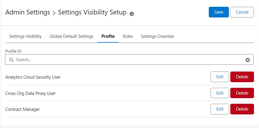 - Access the Settings Visibility Setup page again. The selected setting is shaded in blue, but you still need to select a profile and update the setting.