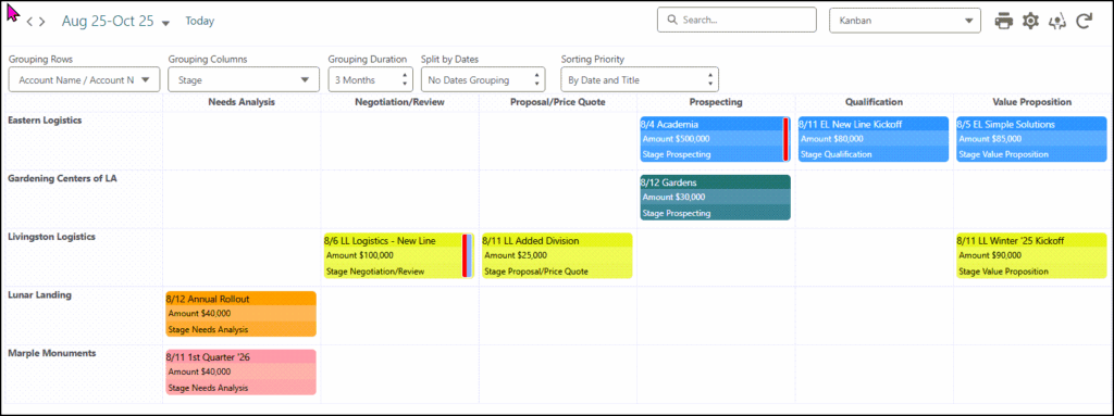 - Kanban View: The Kanban View provides multiple sorting and grouping options, enabling you to see important information at a glance. Multiple updating options also exist. Changes are instantly reflected on the view.