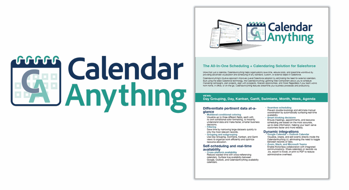 CalendarAnything Lightning Web Component allows you to schedule marketing campaigns, plan projects, align with prospects, forecast opportunities, and more! Regardless if your team works from home, in office, or on-the-go, CalendarAnything features streamline your business processes and productivity.