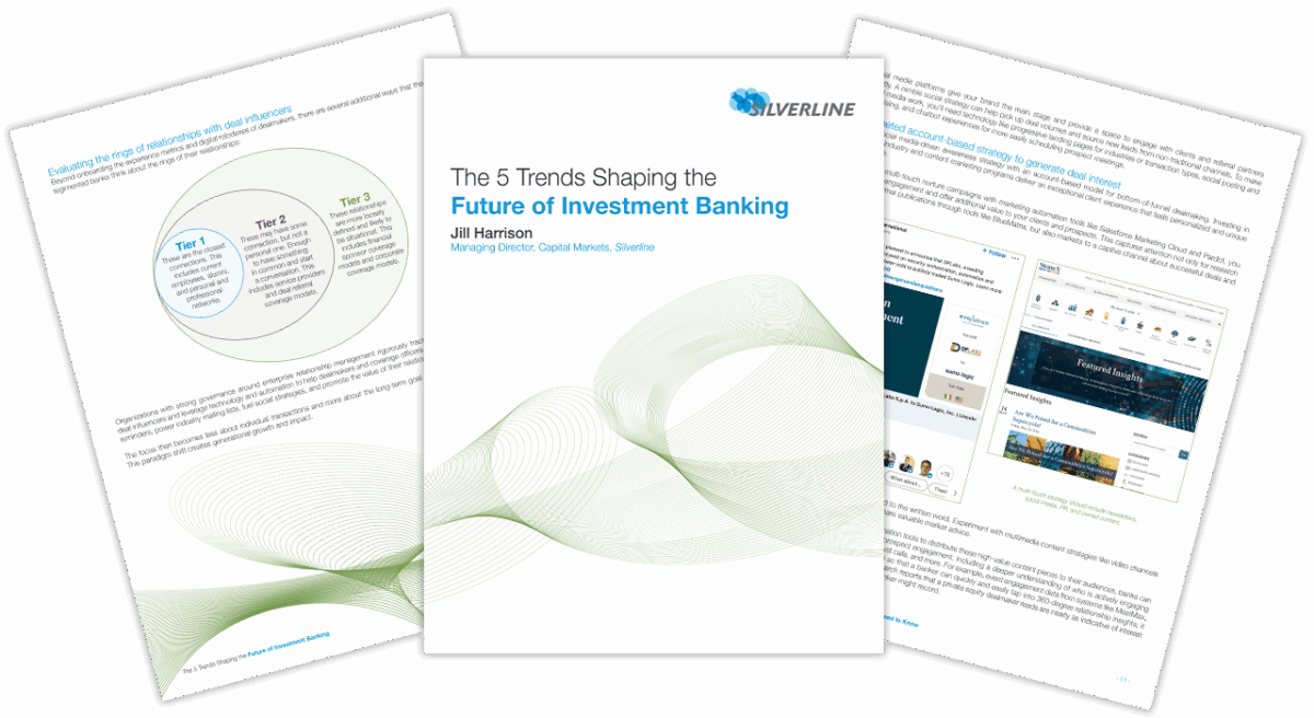 Over the last decade, Silverline has helped 40+ investment banks unlock the power of the Salesforce platform. More than 10,000 bankers in 25 countries are using apps to manage their relationships, pitches, and deals. We’ve had a front-row seat to watch how some of the most high performing teams in the world operate, and how technology can create a competitive edge that sets them apart from their competition.