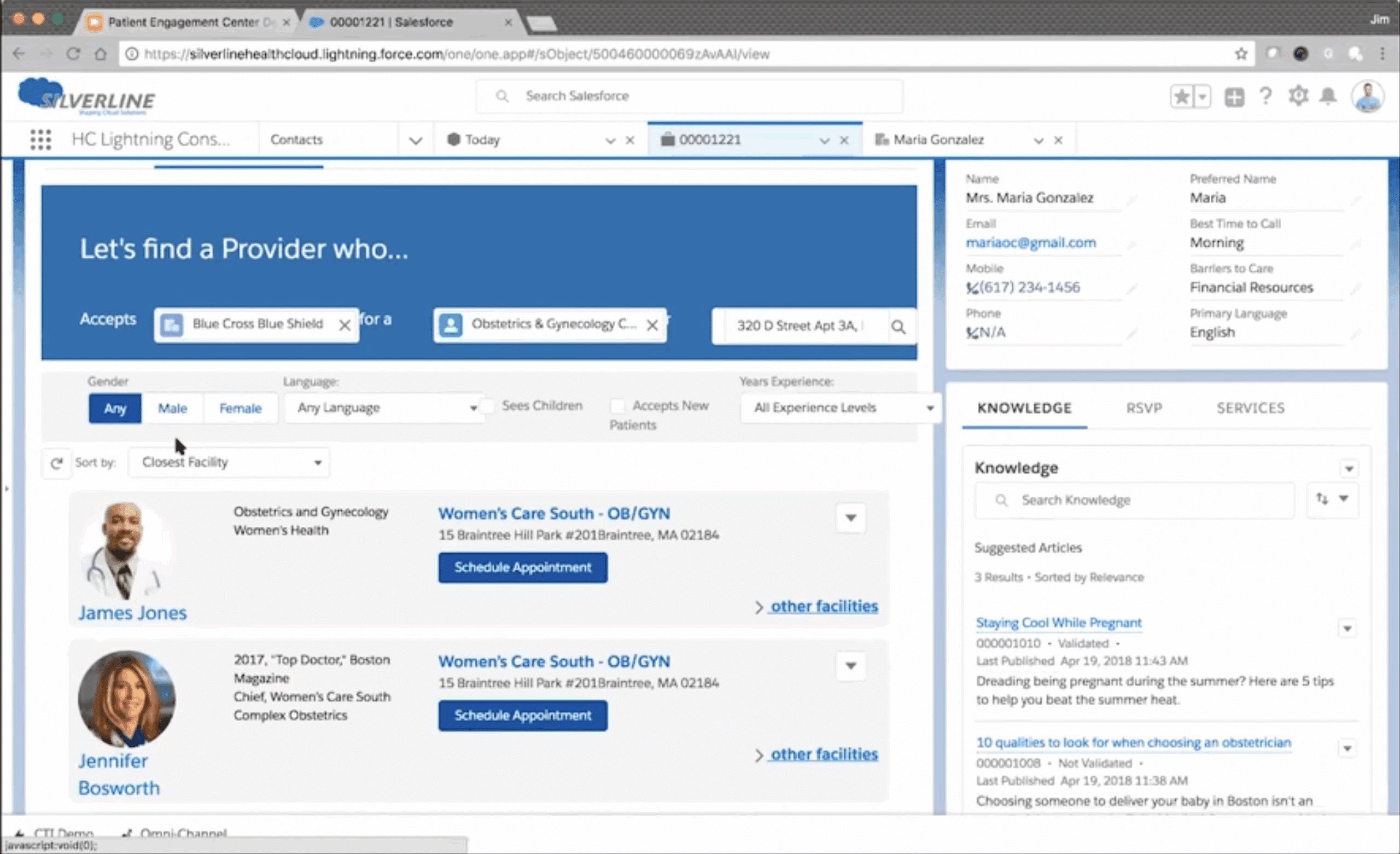Agents in contact centers can view real-time provider availability and complete a scheduling workflow that is consistent, seamless, and informed by relevant patient or member information, including any assessment, registration, or intake procedures.